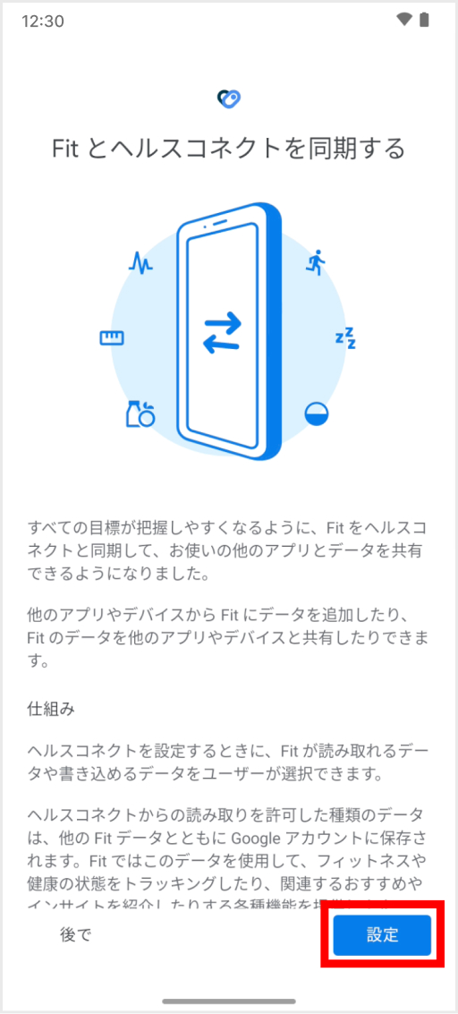 続けて、Google Fitの歩数情報をヘルスコネクトに反映するための連携設定を行います。