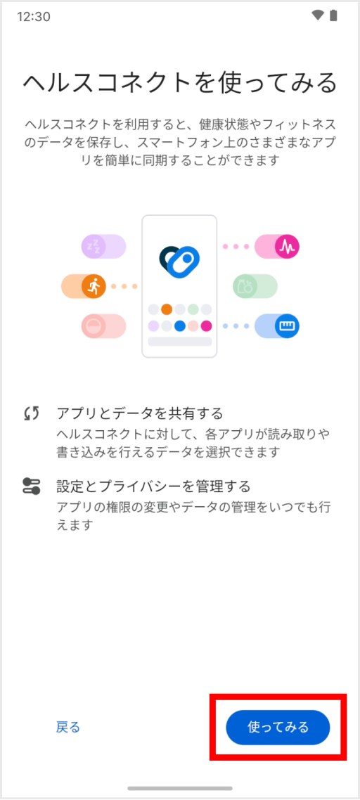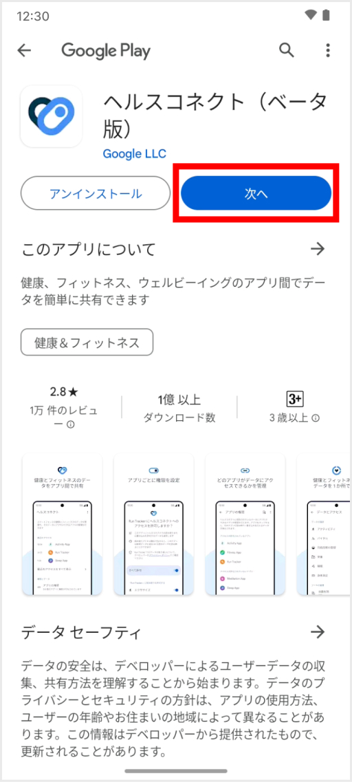 Android OSのバージョンが13以下の場合、別途「ヘルスコネクト」アプリのインストールと連携が必要です。