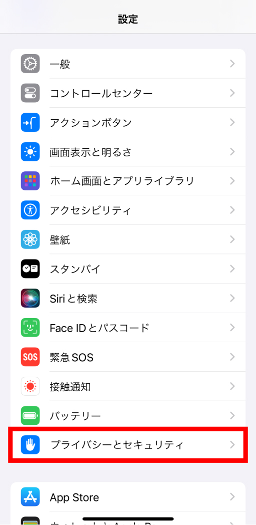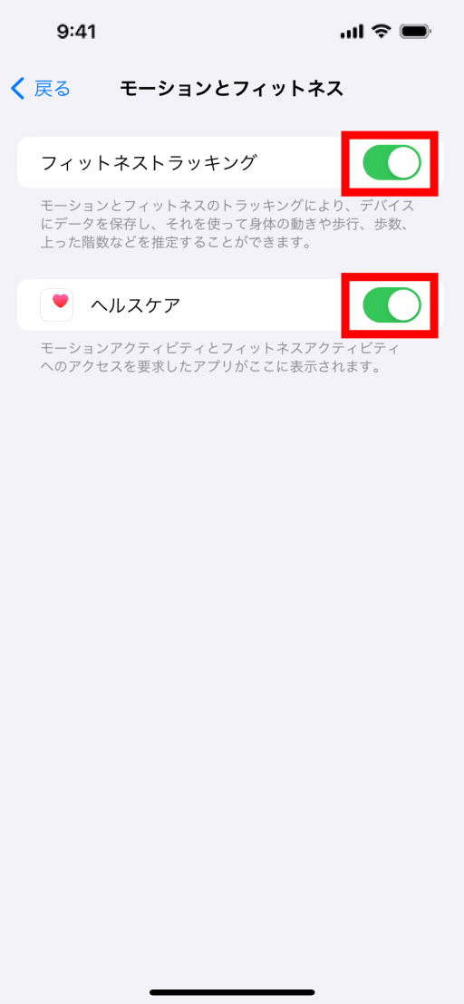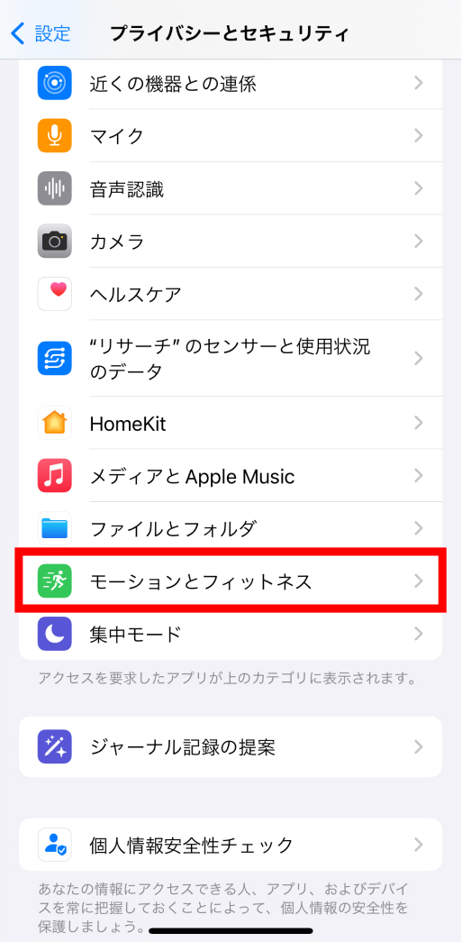 1.「プライバシーとセキュリティ」をタップし、「モーションとフィットネス」「フィットネス・トラッキング」にチェックを入れる(ボタンが緑色に変わります)