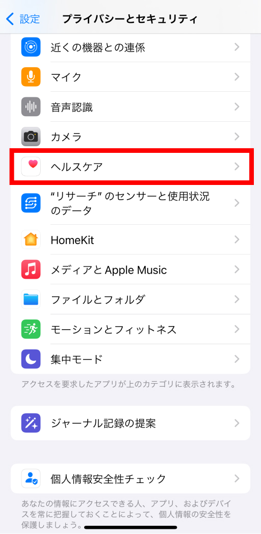 1.「設定」をタップ、「プライバシーとセキュリティ」、「ヘルスケア」順にタップ、アプリ欄の該当アプリをタップ